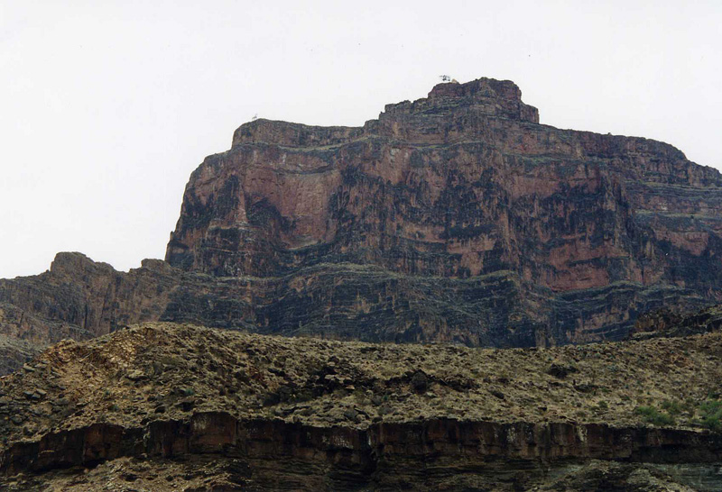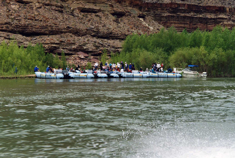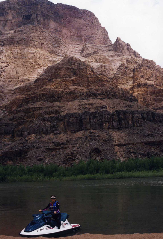 After I bought my Unimog, I decided that I needed something to pull behind it, so I bought a jet ski. I got the top of the line SeaDoo for that year. It was a fun ski, but later developed many mechanical issues and eventually sank. Fortunately, we did not have any issues with it on this trip. Looking at the map, we decided that it would be fun to go to upper Lake Mead at a place called Pierce Ferry. The plan was to launch at the Ferry and run upstream into the lower Grand Canyon. Since it was Memorial Day, we expected it to be hot (it was very hot in the lower deserts near San Diego). But, we were wrong. We had mostly cloudy skys and rain on several days. And, unbeknownst to us, the water in the river was frigid cold -- 42 degrees. The temperature was not due to the season or the weather, but rather the fact that the entire flow of the river was output from Glen Canyon dam and was that temperature all year around. The photos below are scans of chemical pictures.