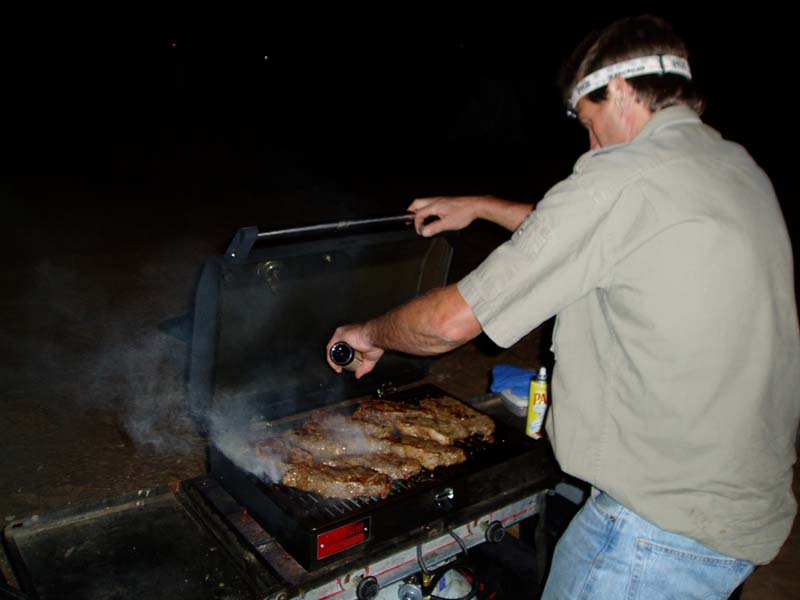 Kai cooks his famous New York strip steaks (carne).
