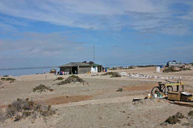 The cook shack with wind generator and radio mast.