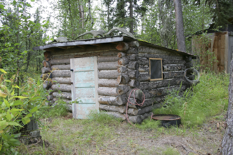 We stopped to see Dan's buddy John Ryer. John has the cabin just upstream, perhaps a mile from Dan's place. He has both a new and an old cabin. The old one is intentionally small so it can be easily and rapidly heated. The new cabin will be better insulated so it should heat nicely too. Unseen in this photo is his .44 magnum pistol sitting on a stump next to the cabin. Bears are a problem here as you will see in the photo below.