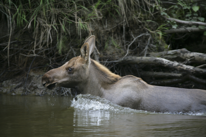 We came around a corner pretty fast and startled this baby moose. He started swimming toward shore.