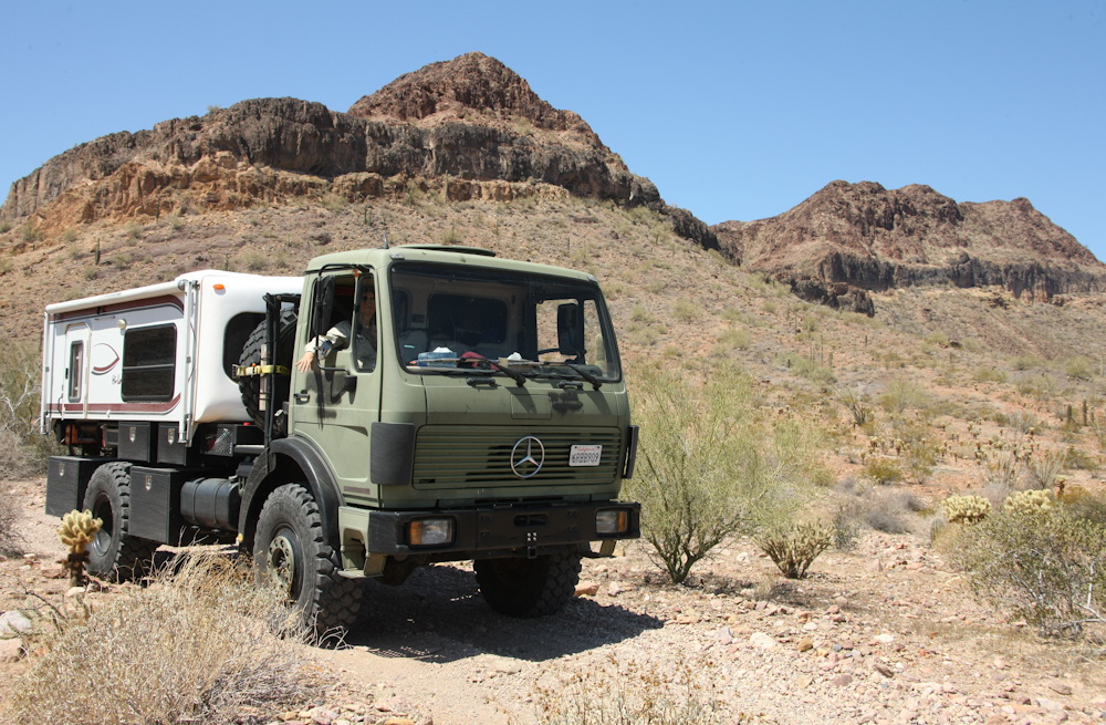 We enjoyed camping with our ex-Musicmatch friends. That said, it was cold, rainy and windy prior to their arrival at the camp. The trail across Kofa is long and rough. A large, wide vehicle like Thor required careful driving and precise wheel placement to prevent real damage. The brush took its toll on Thor's paint and tool boxes. The brush ripped off the weather seal from our door, removed the cap to the black water hose storage area and damaged the hose. We tagged the tool boxes repeatedly due to the steep exit angles required to pass some of the obstacles. But, despite the challenges, the trail was worth it. Not just for bragging rights, but becase of the great scenery.