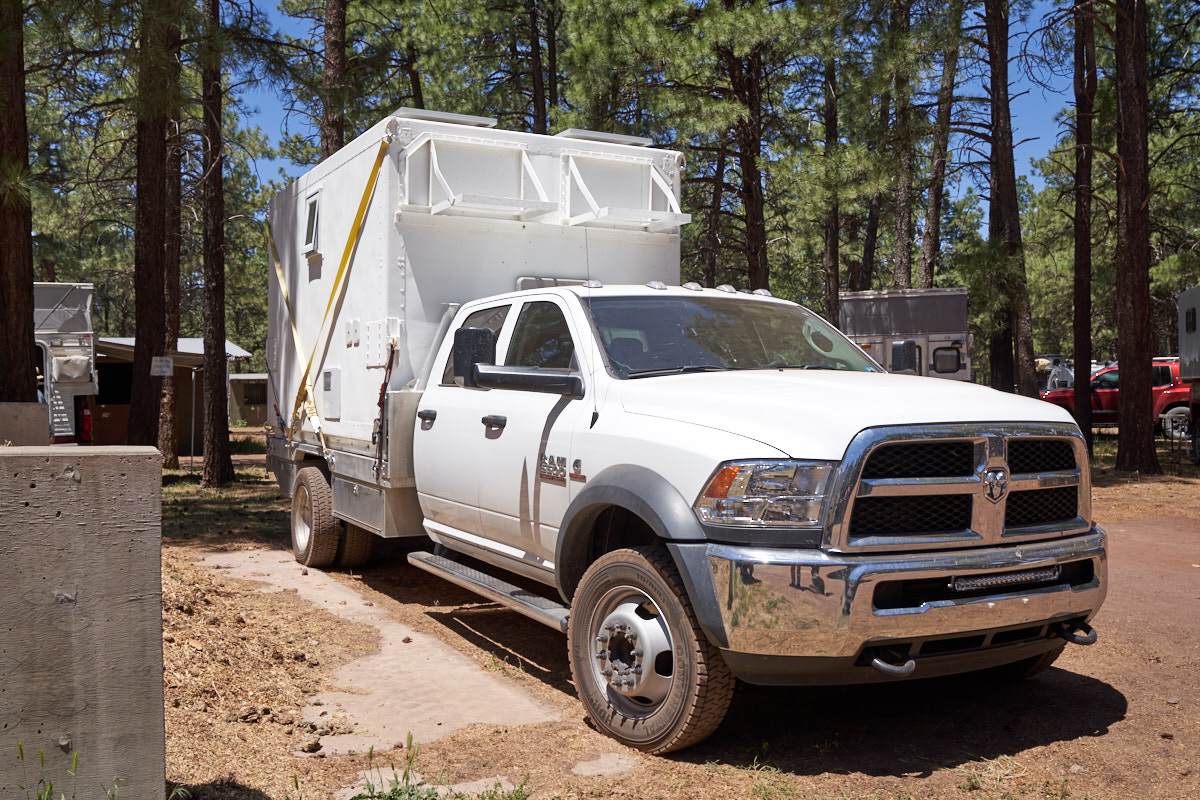 rig based on a Dodge Ram 5500 and an ex-military living shelter.