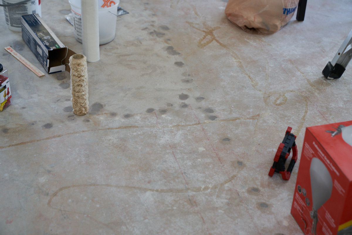 A trip to HD got us concrete patch and spray-on drywall mud.