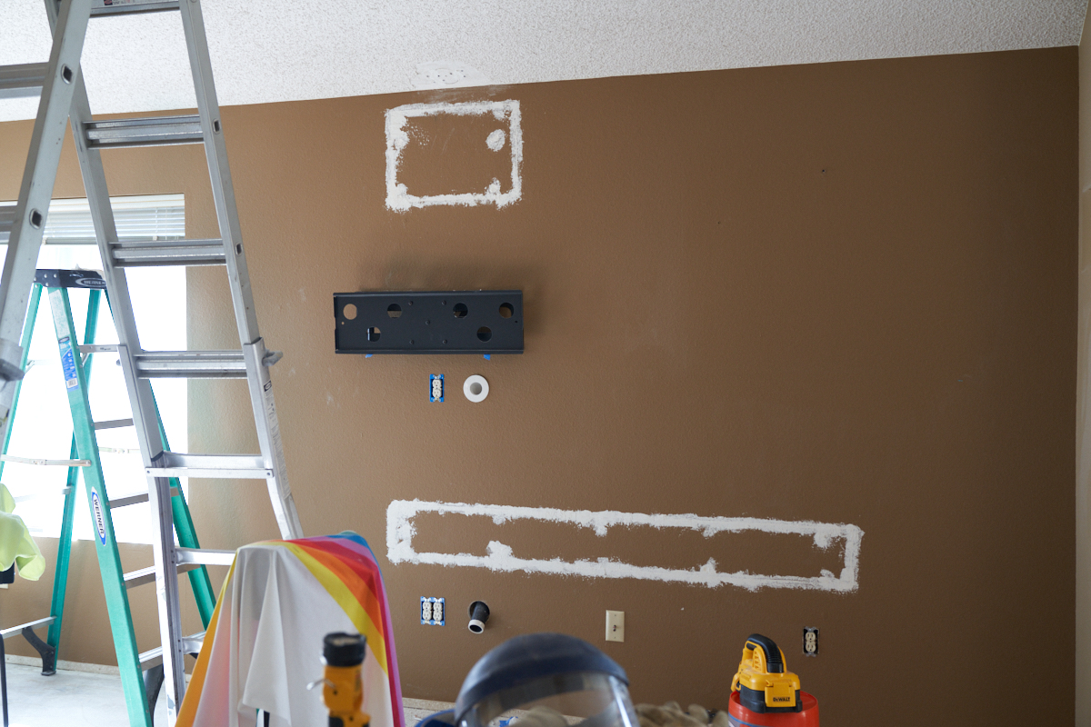 Here, we have the wall torn open to run new lines, add a 4-plex
