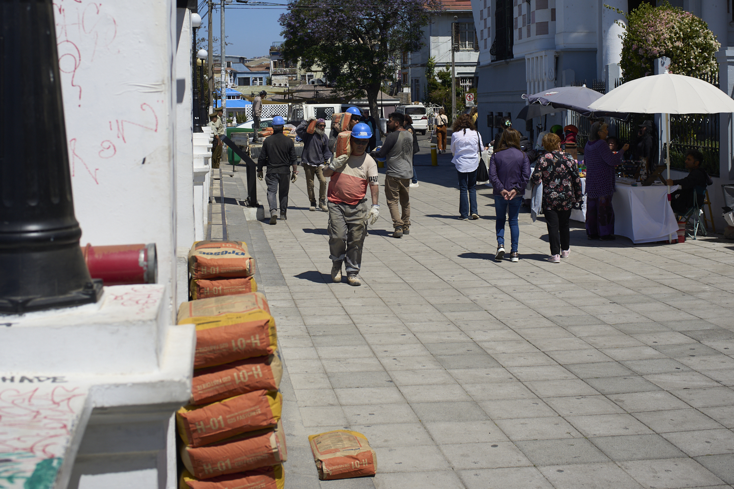work is done manually. Workers carry sacks of concrete to