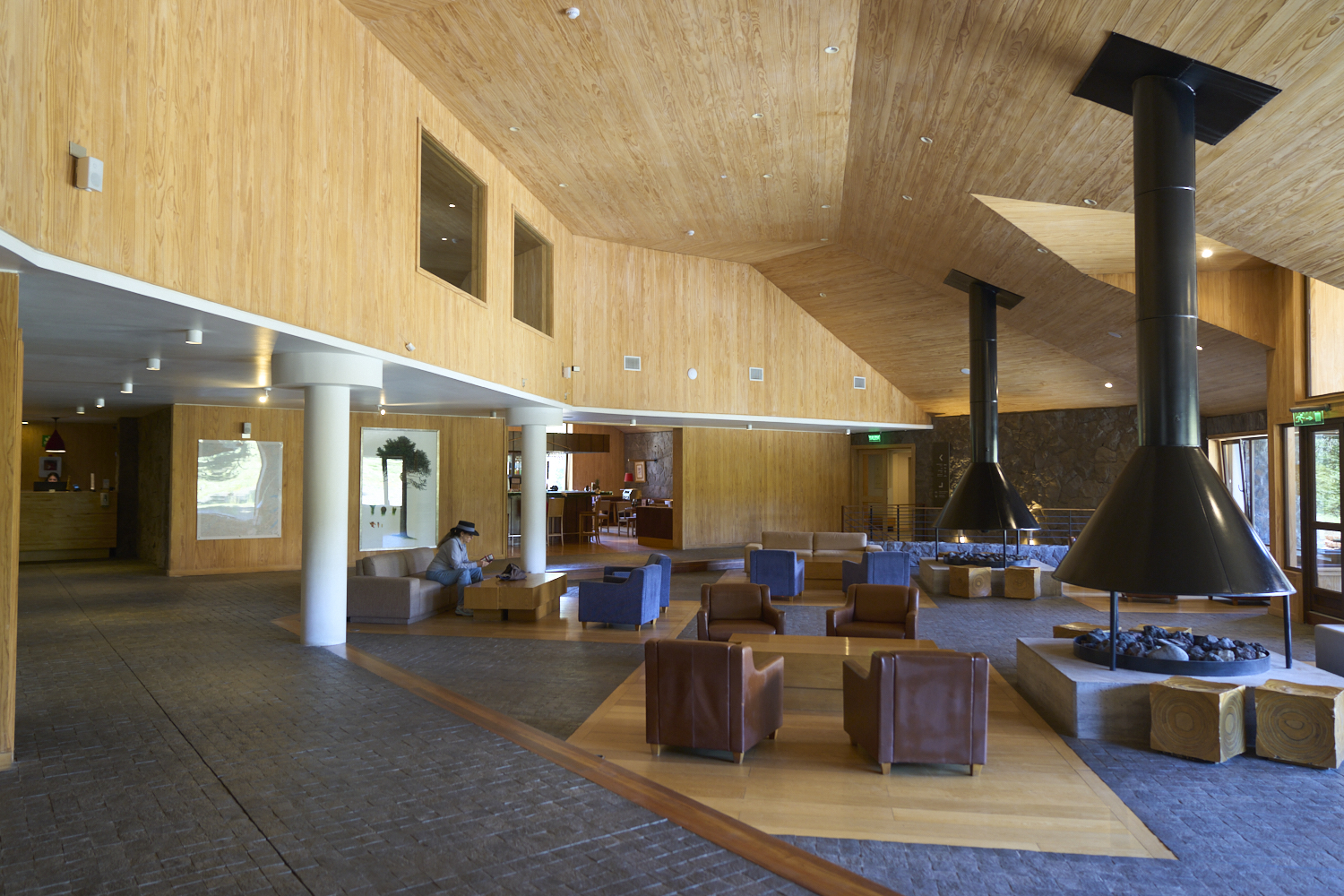 area of the hotel with nice stone flooring and fireplaces.
