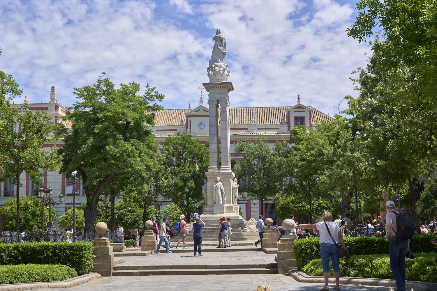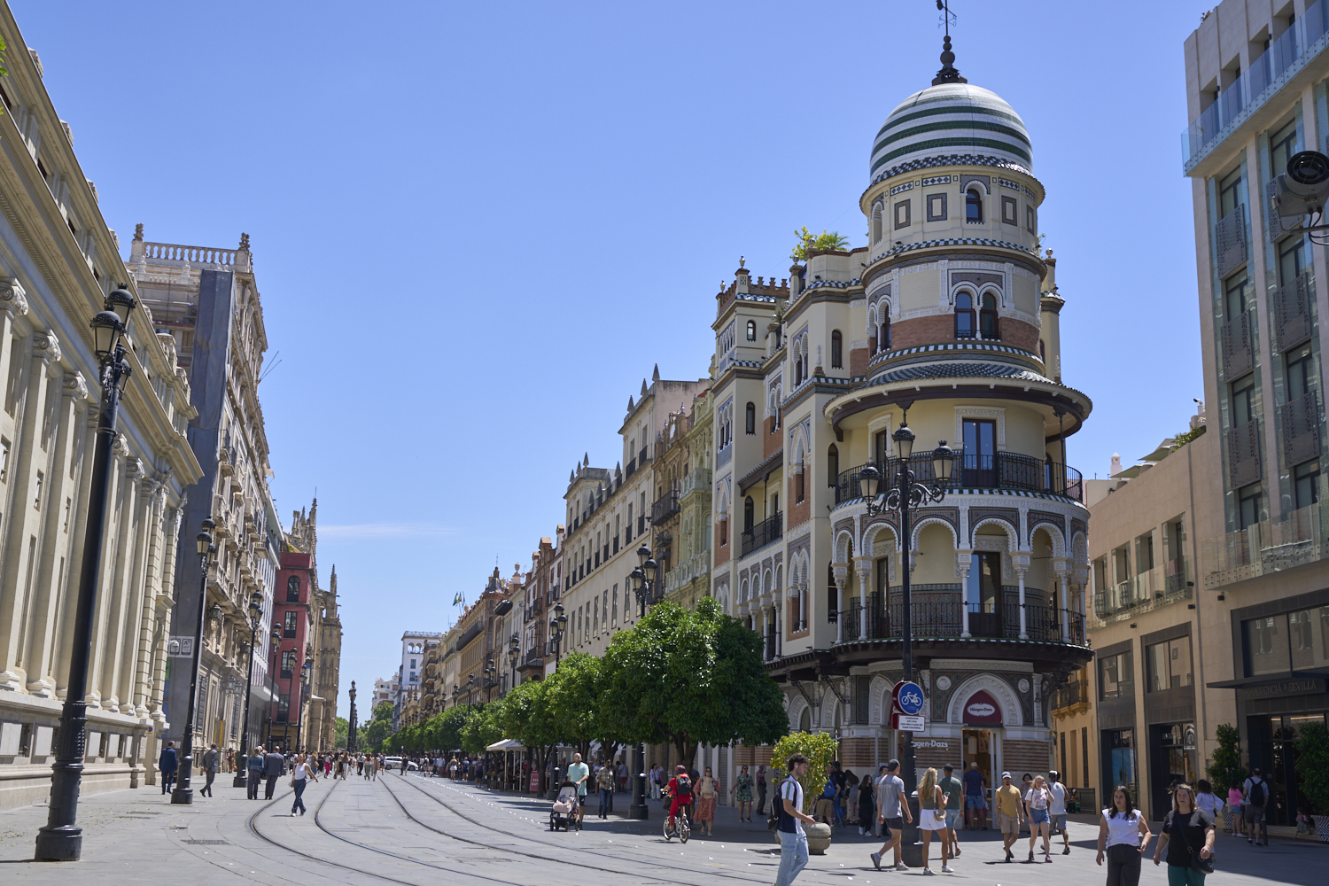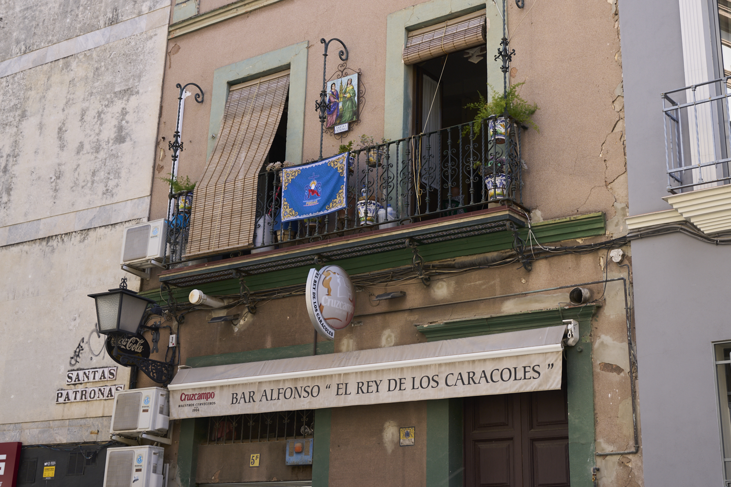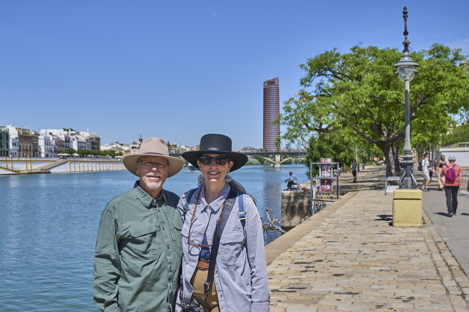 We inverted part of our trip in that we had to taxi from Gibraltar to the border, walk across the border, and then get a taxi to the Algeciras train station. From Algeciras we got the "slow train" to Seville. The trip shot a whole day, but it was reasonably comfortable except for the last, very slow leg. We got into the Santa Justa station and then got a short taxi ride to our hotel near the "center of the action" along the Guadalquivir River at the Triana Bridge. We stayed at the Bequer Hotel, which was very nice. We stayed at this hotel on one of our previous trips to Seville.