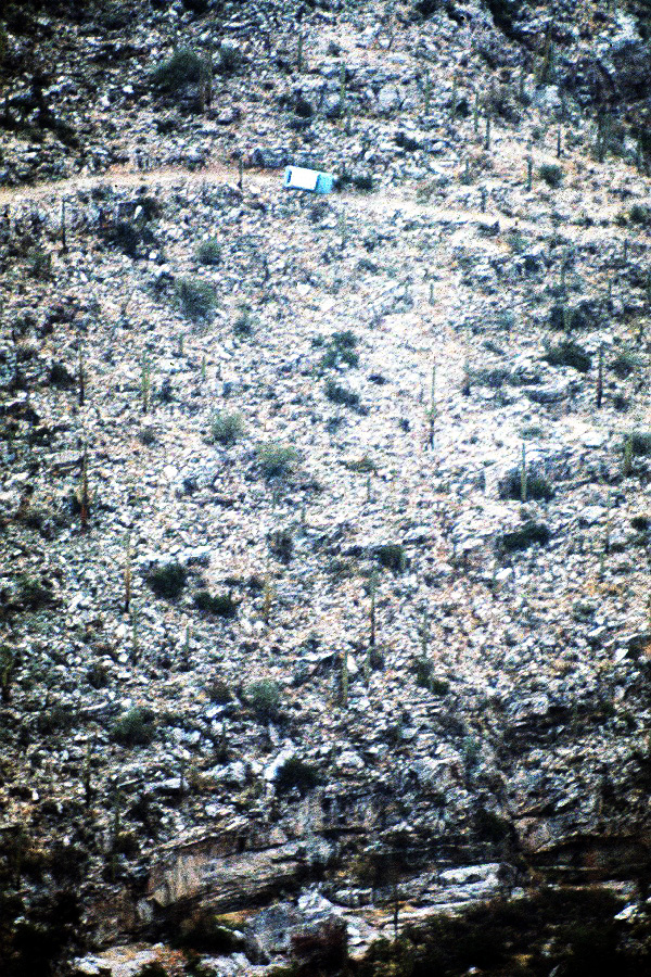 This slide shows the view from across Auga Caliente Canyon. As you can see, it was a overcast day with drizzle and low clouds. The fuzzy area in the center of the screen is fog.