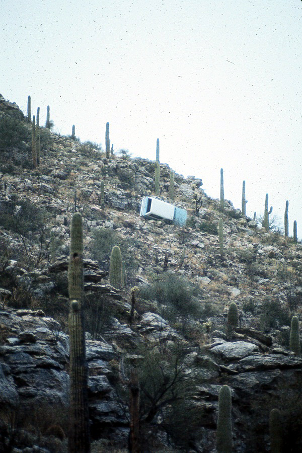 This slide shows the view from the canyon floor below the roll-over site in Auga Caliente Canyon. This shot is through a telephoto lens. Note amount of roof handing over the lip of the cliff.
