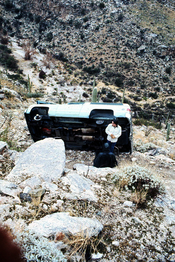 This slide shows looking down on the site from above. Note that the vehicle has been stripped. Missing are two tires and rims, rear drive line, battery, alternator, tool box, one shock, and the steering wheel cover (?).