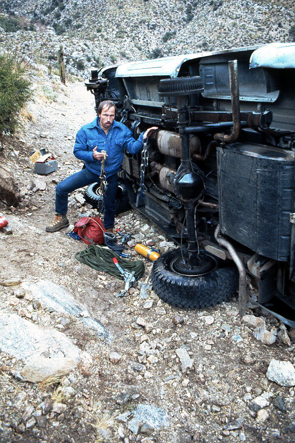 The rock that caused all this havoc was dislodged from the hill by the driver's side tire and can be seen directly to the left of my knee.