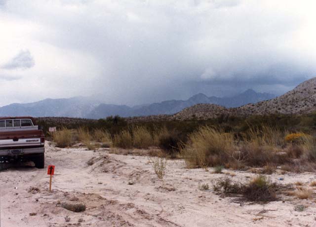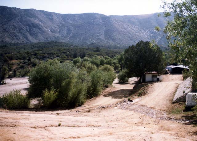 Here is a view looking to the east from the office. Arroyo San Rafael is in the center, the river, and flows down from the 10,000 foot peak of Pichacho del Diablo (Peak of the Devil) that is to the south east of Mike's. The buildings on the right (from right to left) are the garage, workshop/storage and diesel generator shack. The workshop would later become important as Mike had something that I would desperately need to get back to the United States.