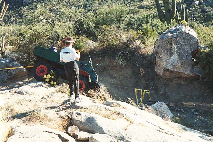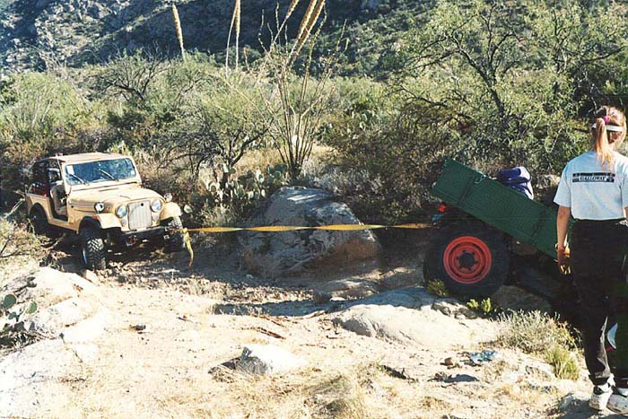 These photos were taken in September 1998 at the Tucson Rough Riders Trail Dust Days 4x4 festival. This trail was Romero Canyon on the north side of the Santa Catalina mountain range. The Catalinas have peaks that are nearly 10,000 feet and the terrain is very rough. Romero canyon is a dead end, terminating short of the main ridge of the range. On this run, only 3 vehicles elected to run the trail. I had come from San Diego especially to attend Trail Dust Days (TDD) to run trails with the 411 and the Rough Riders. This section is narrow, and has big ruts.