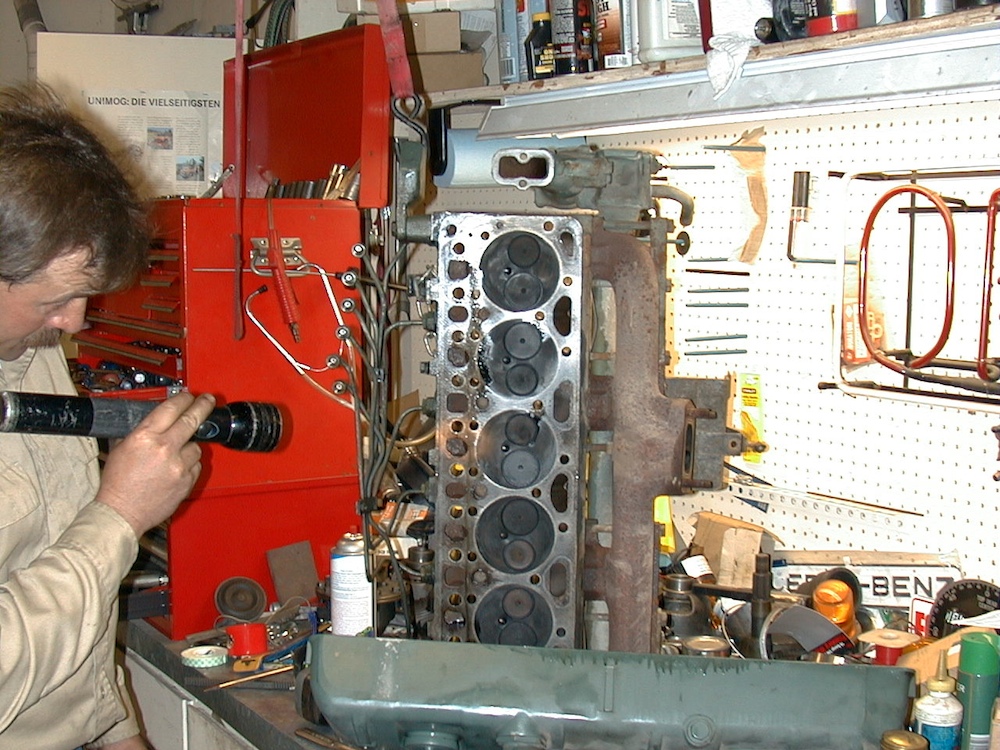 Kai examines the head. Note the valve cover on the bench at the bottom of the photo.