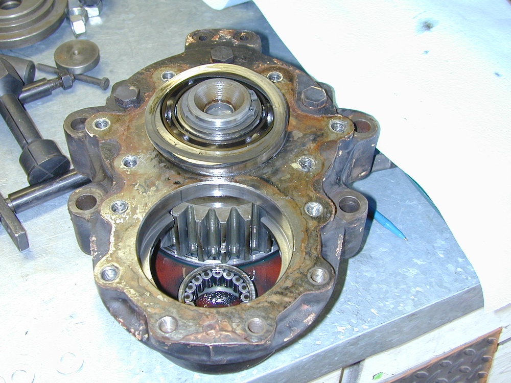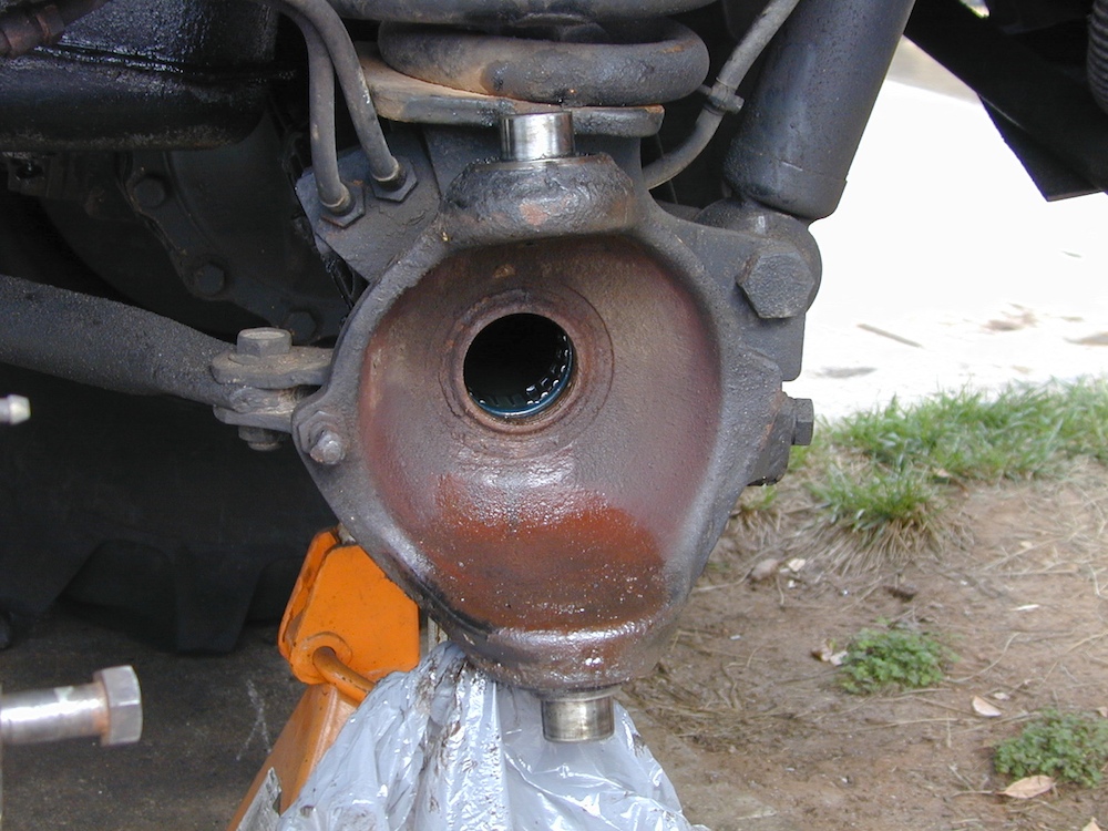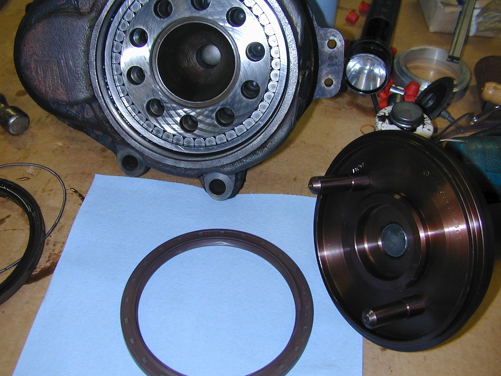 New bearings tapped into housing with tool on the right. The new oil seal is at the bottom center awaiting assembly.