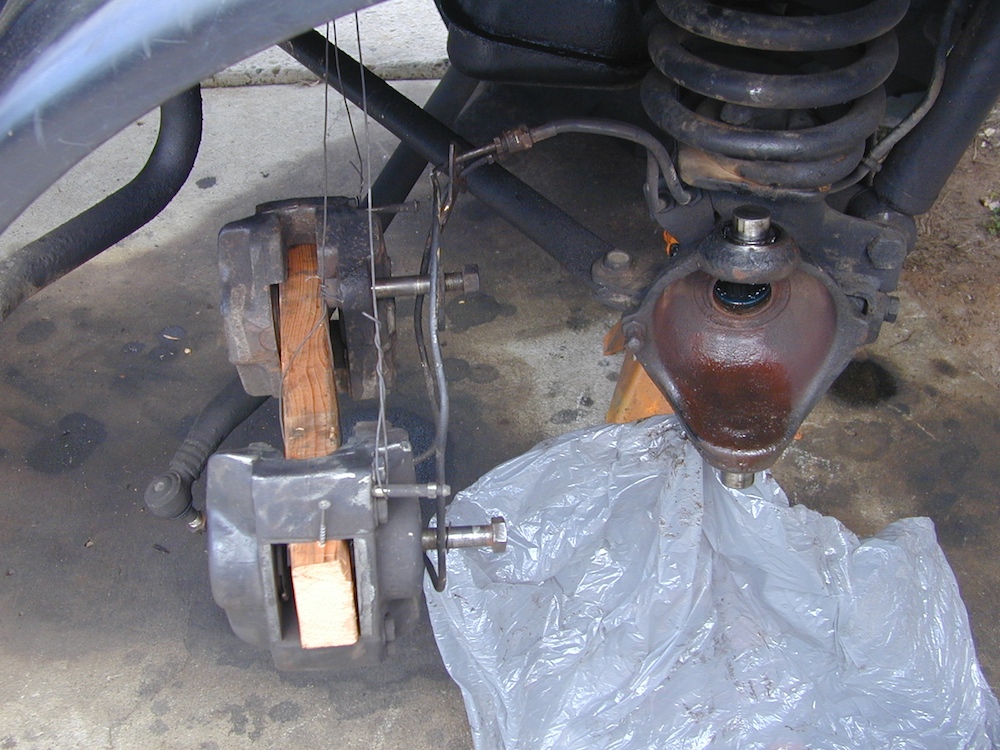 The brake caliper assembly is hung from wire to prevent air getting into the lines. Note the wood in the piston area to prevent the pistons from coming out.