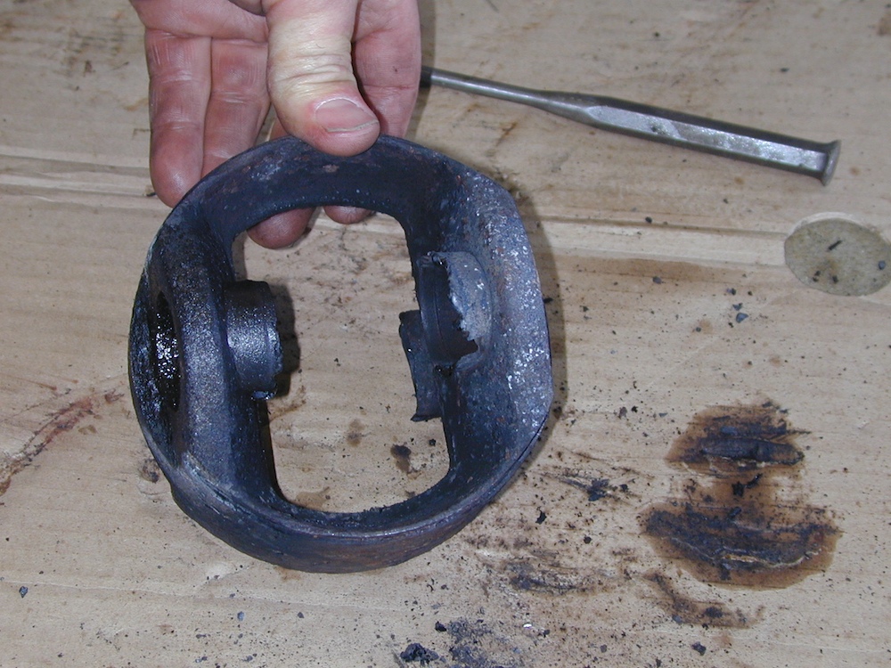 The wear ring had to be cut off the axle shaft. Note the pits on the ring.