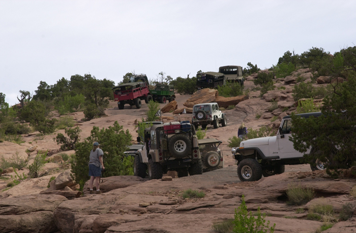 The Moab Rim Trail is one of the most challenging trails in the area. It has some difficult obstacles and the ever-present psychological fry that you are heading up the side of a cliff. Some folks have rolled and if you are unlucky enough to roll near the start of the trail, you go the distance. Rolls further up, while probably not fatal, will be expensive. As you will see in the photos below, you ascend a slab with a away-from-the-cliff cant on the trail.
