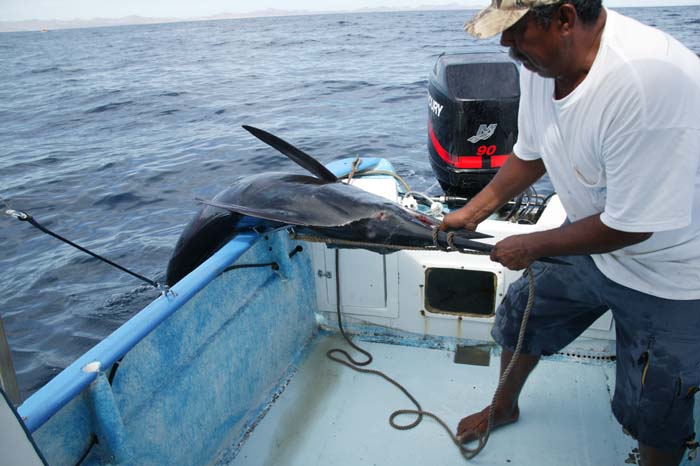 After a substantial battle lasting about 30 minutes, she got the marlin to the boat. Juan gaffed it with the "flying gaff" and we beat it to death with the ball bat. This is normal procedure because the last thing you want in your small boat is a big, strong, really mad fish with a pointed bill flopping around in the boat. Here Juan hauls it over the side.