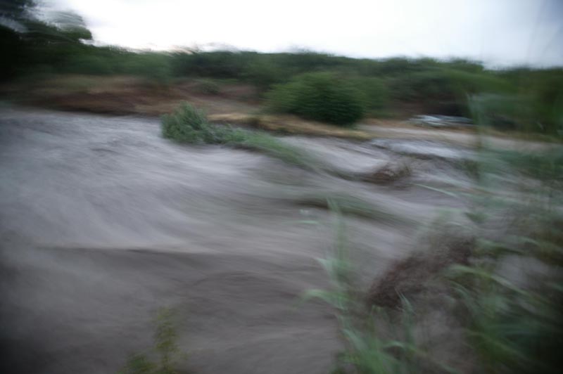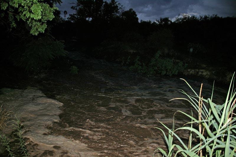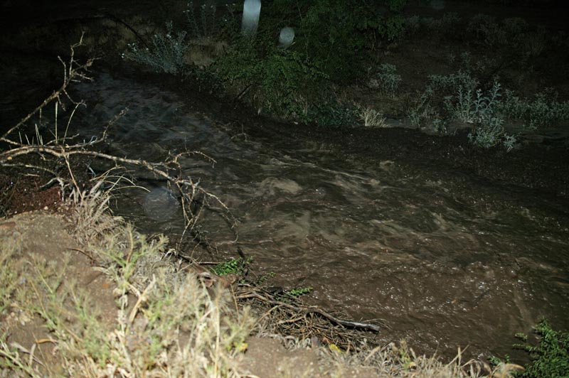 Kathleen, Sandee and I chatted and drank. It was clear that as the rain progressed, Sandee was getting more and more restless. Having suffered the death of her neighbor and substantial damage to her place back in 2003, she was very wary. Meanwhile, we lit the bbq and prepared to cook some chicken. As the chicken was done ,we served up the food. The rain continued to intensify as we ate. Finally, Sandee requested that we help her test the flood alarm. After the events of 2003, she had the alarm company install a water alarm that would notify he when the water in the wash reached a certain level so she and her daughters would have time to evacuate if needed. She left the house and poured water in the sensor. To our collective relief, the alarm sounded as it was supposed to. We returned to eating our chicken and salad. Within another minute after the test, the alarm went off again. I assumed that the system had not been fully reset. We stood to look at the wash out the front window and to our dismay, it was running. Strong. Within seconds, the second stage alert alarm sounded. Something closely akin to panic overtook all of us. I grabbed my camera and ran outside. It was raining pretty hard. I ran to the creek and took the shot below. The waters were surging, strong and cold, the color of chocolate milk. The water was heavy with suspended mud and debris.