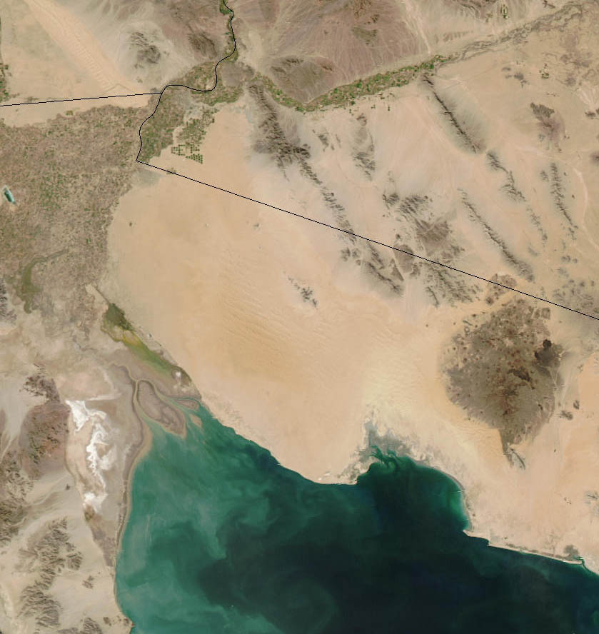 In Figure 1, San Diego bay is just below the top edge on the left. The large lake is the Salton Sea. Farmed areas are shown in red. The road in Mexico that parallels the border can be seen. The Pinacates are also visible next to the border in the top-middle of the image.