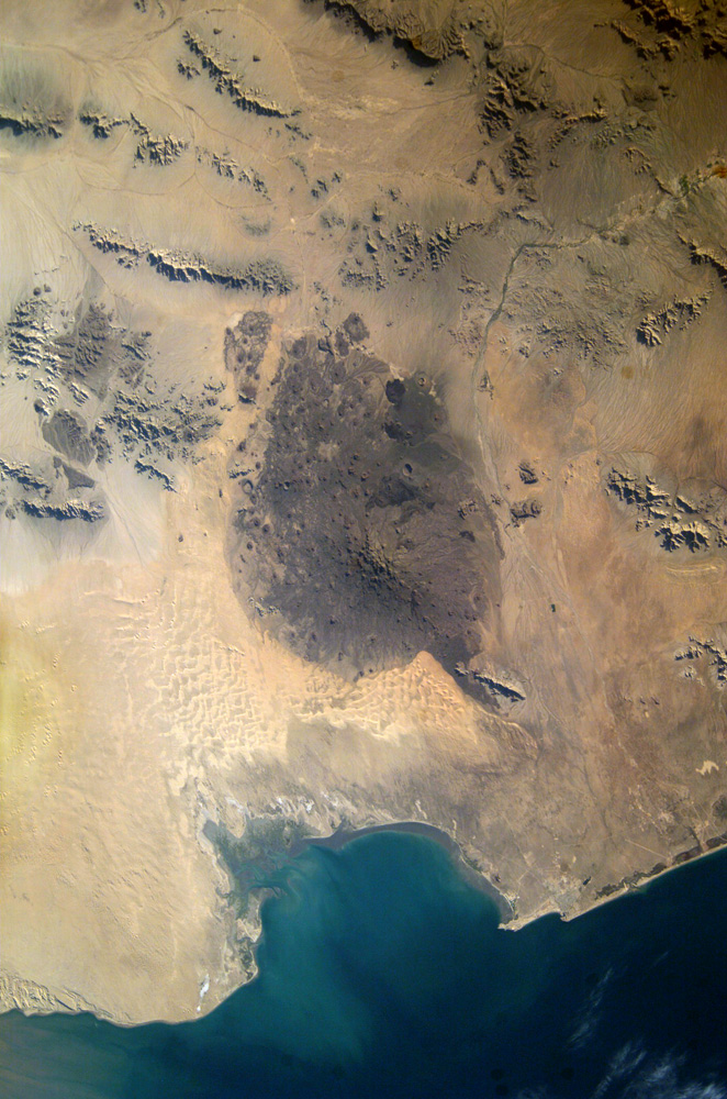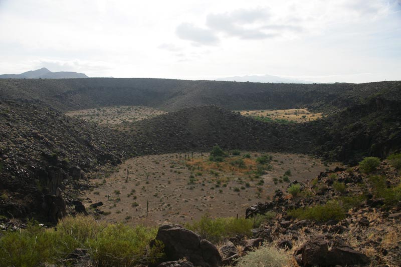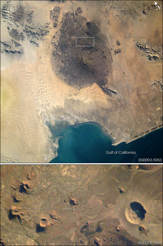 Early in May 2004, the new Space Station crew (ISS-9) obtained high-resolution images of the Pinacates, allowing for detailed observations of the surface features. One example is a large volcanic crater (see box, and detail below) called Crater Elegante which is one of the most prominent and interesting features of the Pinacates. For scale, the diameter of the crater is approximately 1500 meters.