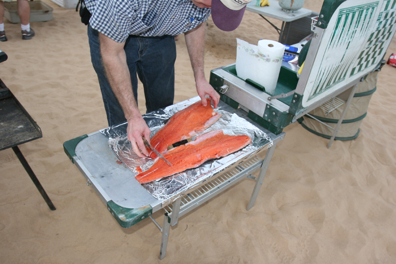 Tony preparing his whole salmon that he brought with him from Fairbanks, AK.