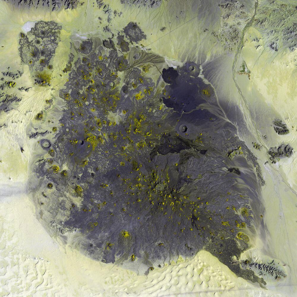 This image of the park was captured by the Landsat 7 satellite on December 5, 2002, using bands 7, 5, and 2. The dark cinders covering the lava plain dominate the center of the scene, and numerous circular craters are visible. To the south, the sands of the Sonora Desert are carved into sinuous dunes. At top center, a diagonal gray line marks a road that runs toward the Mexico-U.S. border.