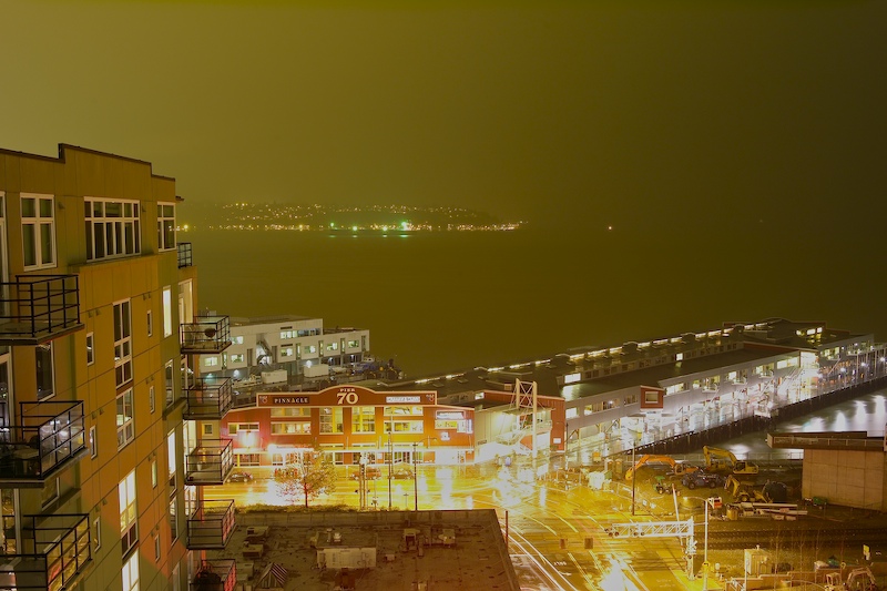 A slightly over exposed shot of pier 70 across the street from our apartment. Note the illumination in the air that is a result of the street lights interacting with the fog. The streets are slick with rain, reflecting the sodium yellow steet lights. Alki beach and west Seattle are visible in the distance. This was a 24 second exposure with automatic noise reduction.