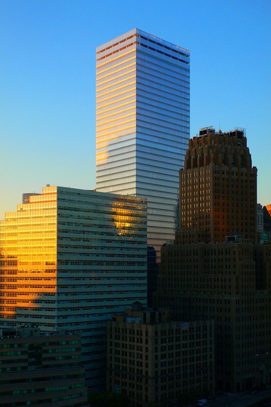 The golden light of sunrise reflects off the Bank of NY (left) and 7 World Trade Center (center) buildings. The ugly brick building is the Verizon building.