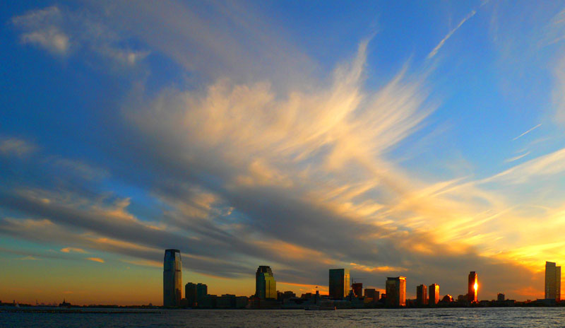 The final rays of sunset reflect off the buildings on the Jersey City waterfront while a Circle Lines tour boat passes. Note the jet on takeoff from Newark airport.