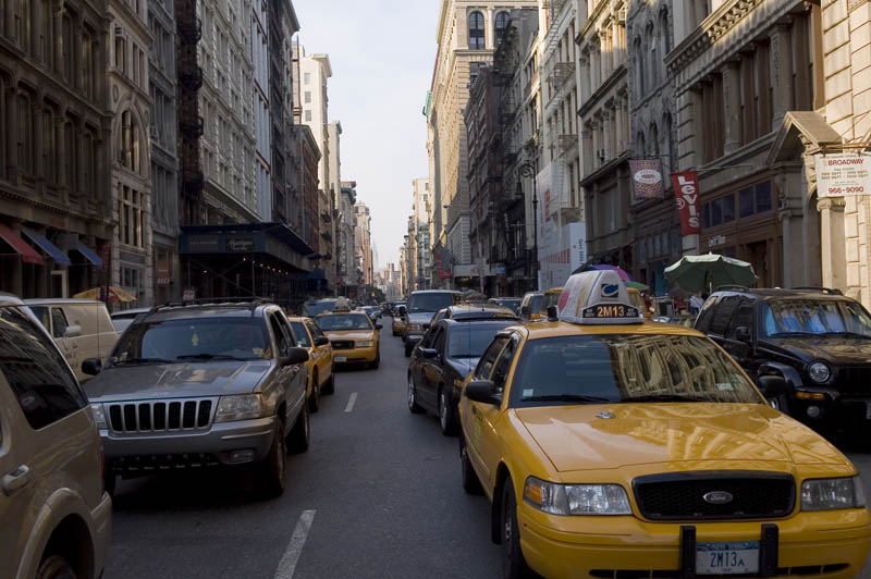 Looking north toward the Empire State Building which is visible on the left side of the road in the distance.