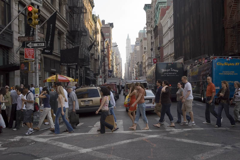 Saturday afternoon Soho shoppers at Spring and Broadway. Woolworth building is the tall one in the distance.