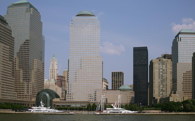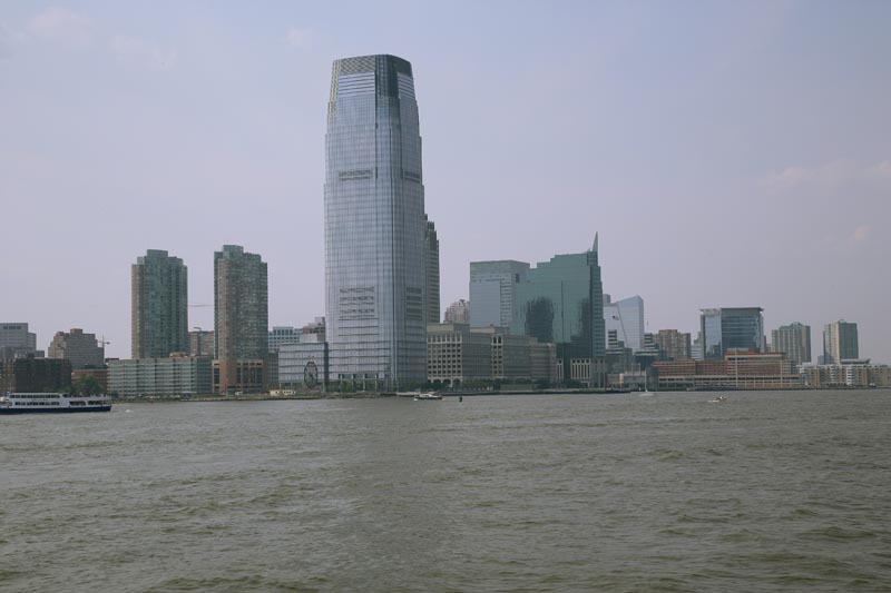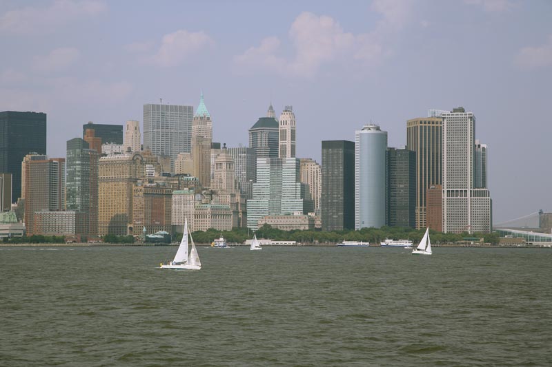 West side of lower Manhattan. The Bank of Manhattan Building is the one with the peaked, light green roof. The color is from oxidized copper as the roof is made of copper. There were lots of sailboats on the river enjoying the sunshine and moderate breezes.