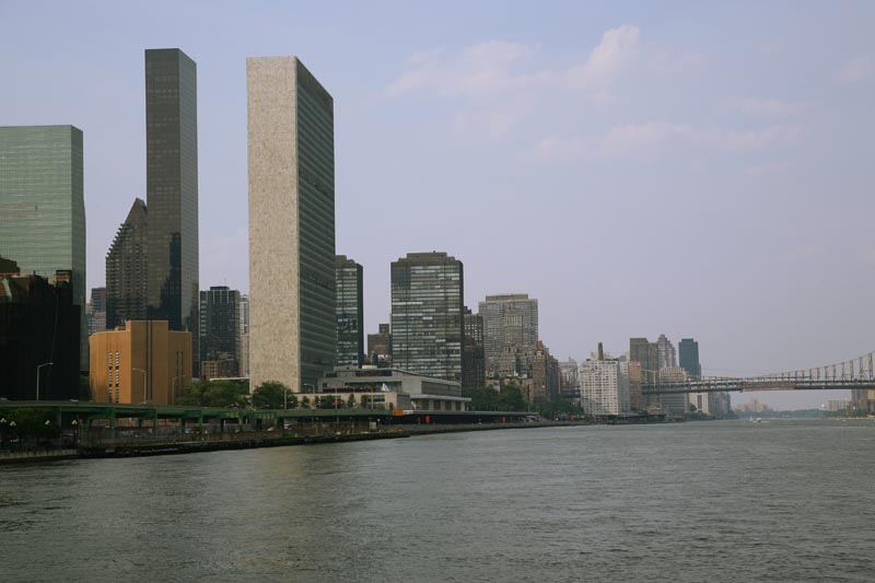 UN Building on the east river. The tall one is Trump Tower.