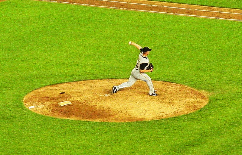 Pirates pitcher delivers. This shot, like all shots in this set, were taken with my Canon 1Ds Mark 2 camera. This is a 16mp camera with a 24-105mm zoom lens. The shot above was taken from our seats at 105mm, then cropped to "actual pixels'. The color rendition is via a Photoshop plug-in Alienskin "Exposure" that provides an emulation of Fuji Velvia film. This shot is a crop of the same view as the previous photo, but a second later.