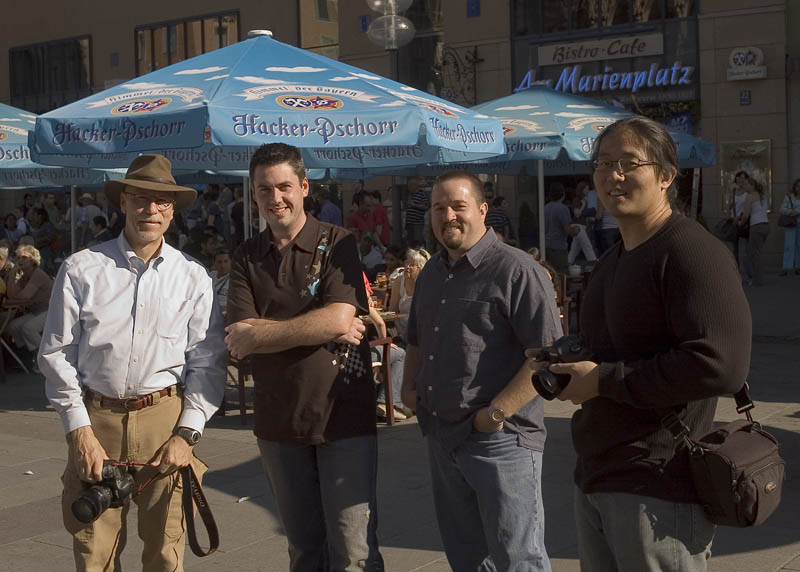 Caught in the act: Bill, Todd, Eric, Mike. Note the umbrella with the Hacker logo.