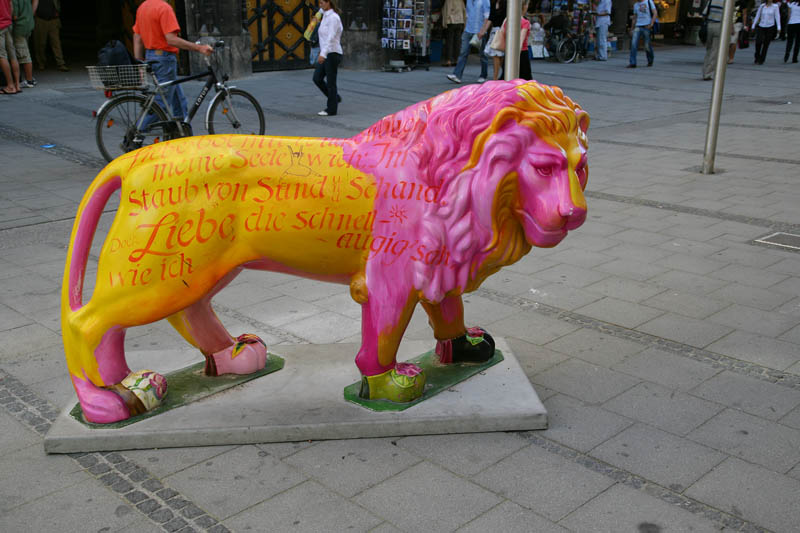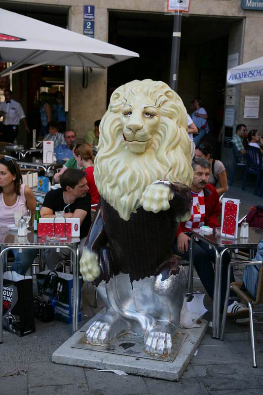 It took me awhile to figure out why there were so many lions around the Marienplatz. Seems that the lion is the symbol of the recently past monarchy. So, there were tons of lions of various types around the city. Here is a great specimen, complete with psychedelic color schemes.