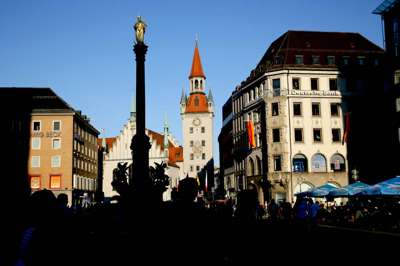 Another view of some of the towers and monuments in the Marienplatz as the sun sets and cast long shadows.