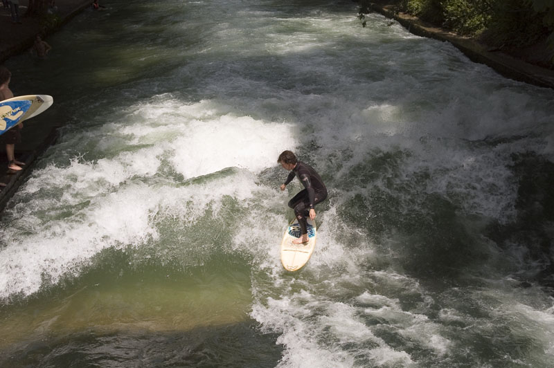 One of the rivers heads through a weir. The outfall creates a giant standing wave allowing stationary surfing. Here a fellow in a wet suit navigates the wave. There were lines of folks on the banks waiting their turn to jump in. Only one person at a time could be in the hole.