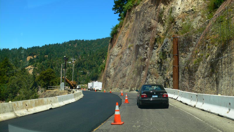 Highway 1 had construction. So did 101. Here you can see the cliff under repair. Note the wire mesh that is used to prevent rocks from falling on the traffic. The road work did add substantial time to the travel, but in the end it was little more than an inconvenience.