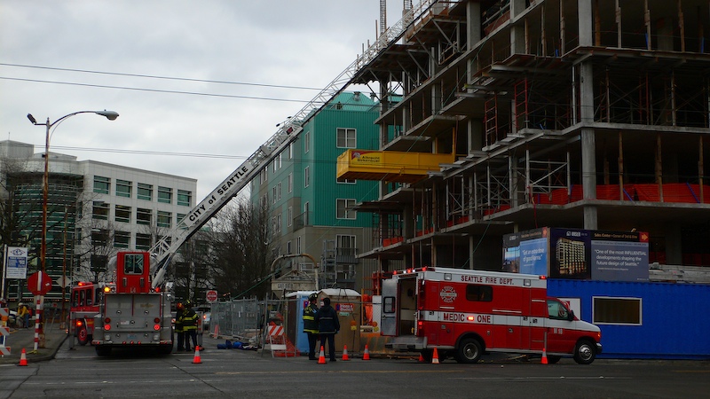 On Monday morning, I was on my way to work, I was confronted with the normal things. A view of the Space Needle and other sights on would associate with the Belltown area of Seattle. But, there was more. The building across the street from my workplace had been under construction for some time. Sadly, one of the construction workers suffered an on-the-job accident that require a rather dramatic rescue operation. I only had my "briefcase" camera, so the photos were not up to normal standards. The photos below are what I saw.