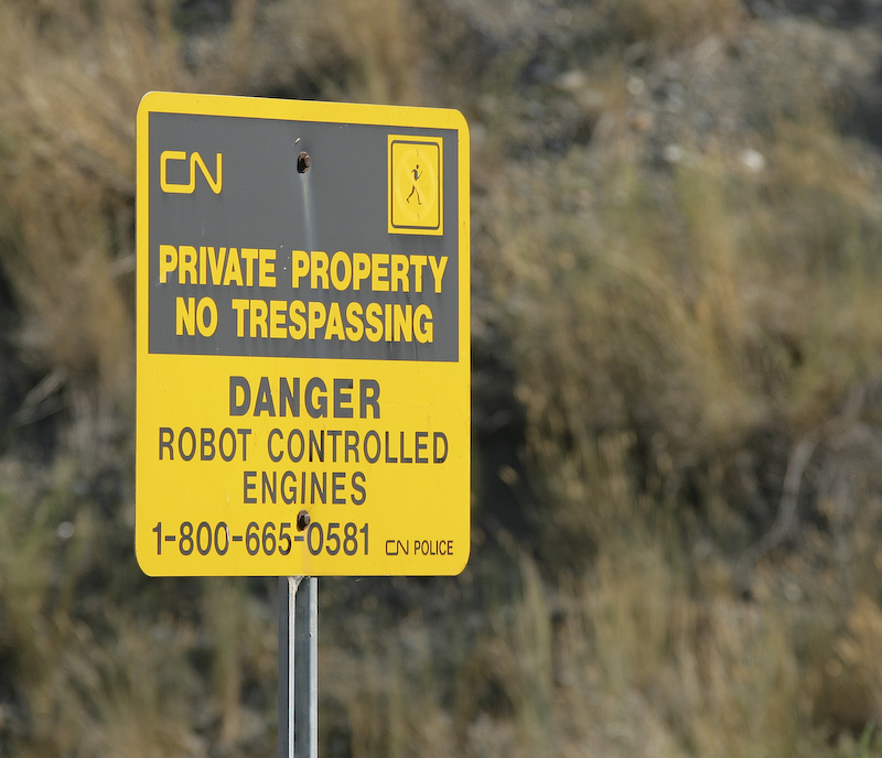 This sign says it all. Later in the day, we saw one of the robot engines. The sign is misleading in that the engines are human controlled, but the humans are not in the cab. Therefore, you should not expect the train to do rational things, like stopping for a car stalled at a grade crossing.