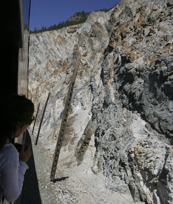 Since the mountains are continuously bleeding rocks, this causes operational issues for the railroad. Here, you can see scree sheds that were constructed to divert the flow of rocks over the tracks.