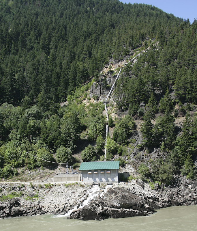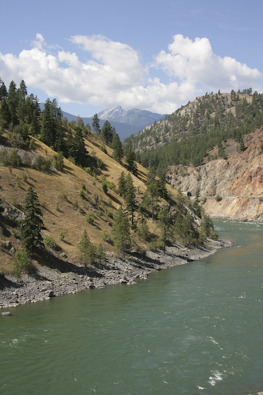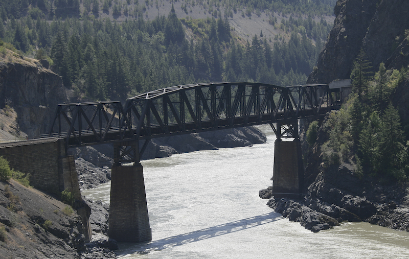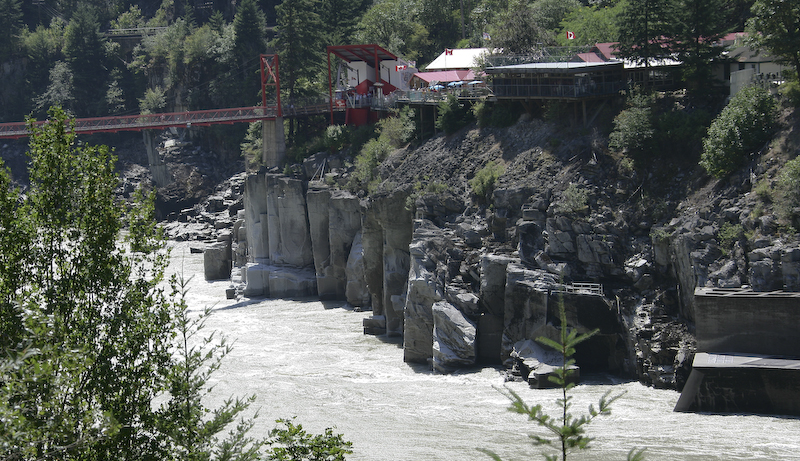 The approach to the Hell's Gate section of the river. Note the bridge over the river and a fish ladder in the lower right.