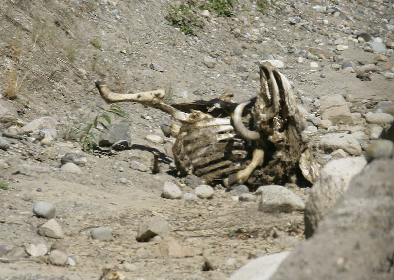 Railroads can be dangerous. In this case, a cow was hit by a freighter and subsequently picked clean by the local animals. Roberto : This is a skinny skinny cow.