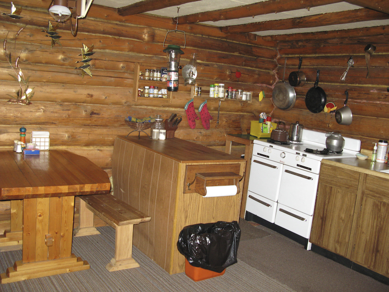 A storage area with the refrigerator. The frig is the can on the right that is buried into the ground. It keeps thing around 40 degrees during the summer due to the permafrost.