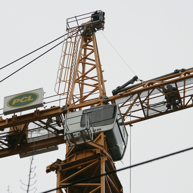 Ropes are used to steady the load as it is being lifted. Note that the crane's operator cab tilts.