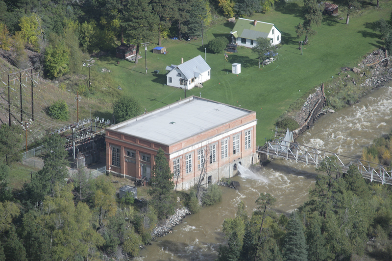 This is the Tacoma power plant. The plan is powered by a stream that comes from the mesa to the left and falls many hundreds of feet. The plant is one of the oldest in the area.